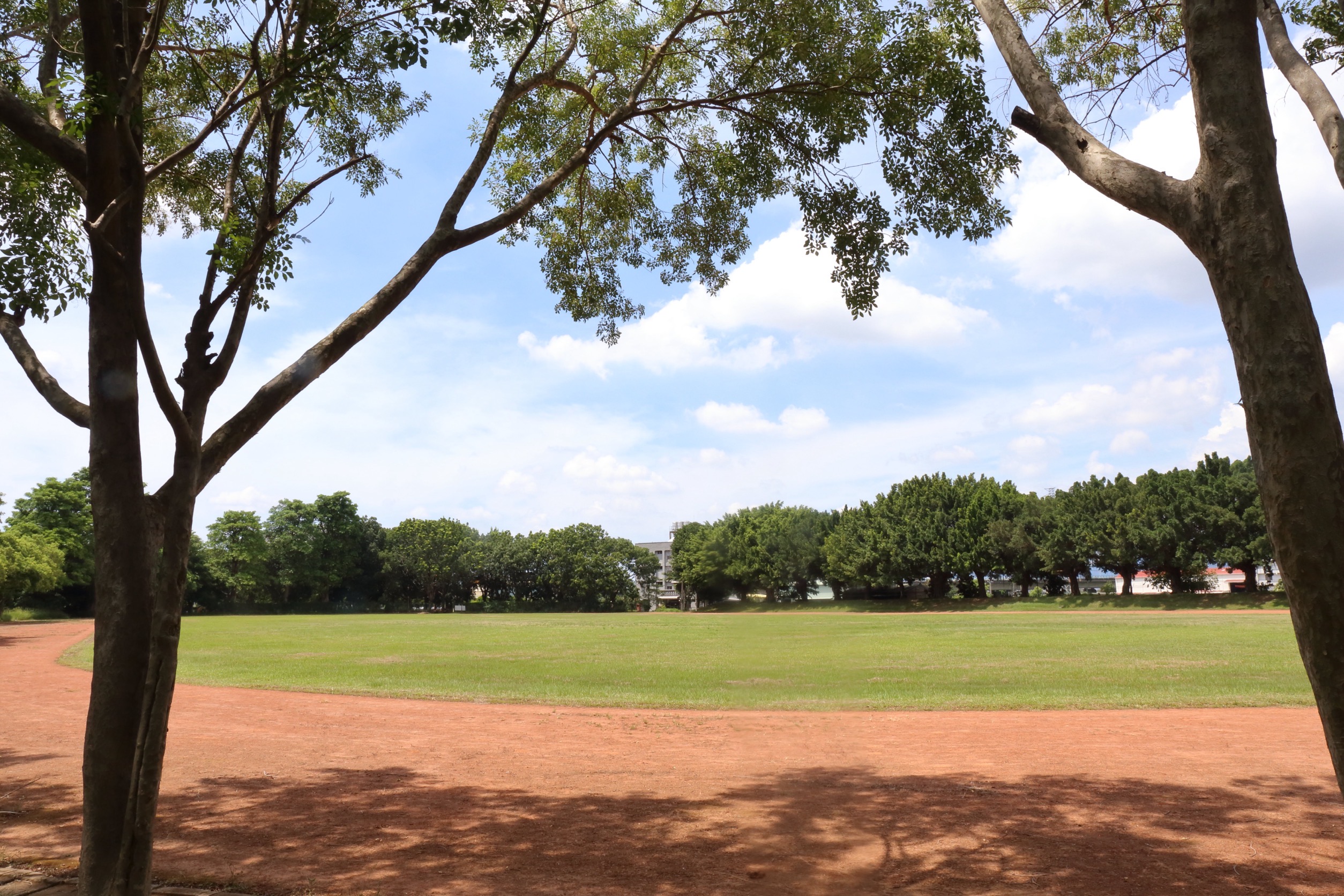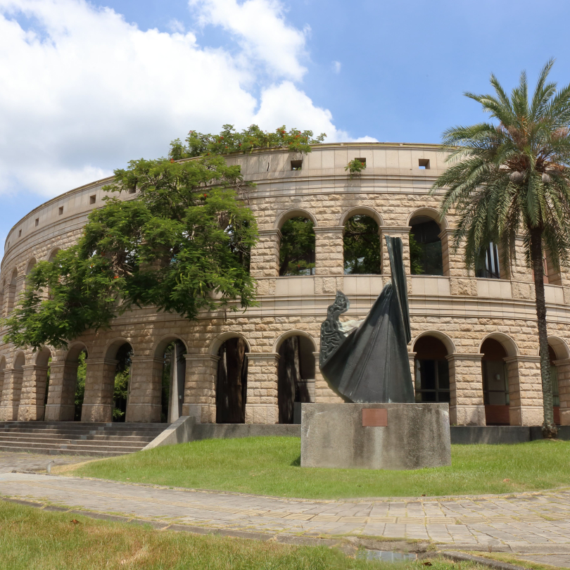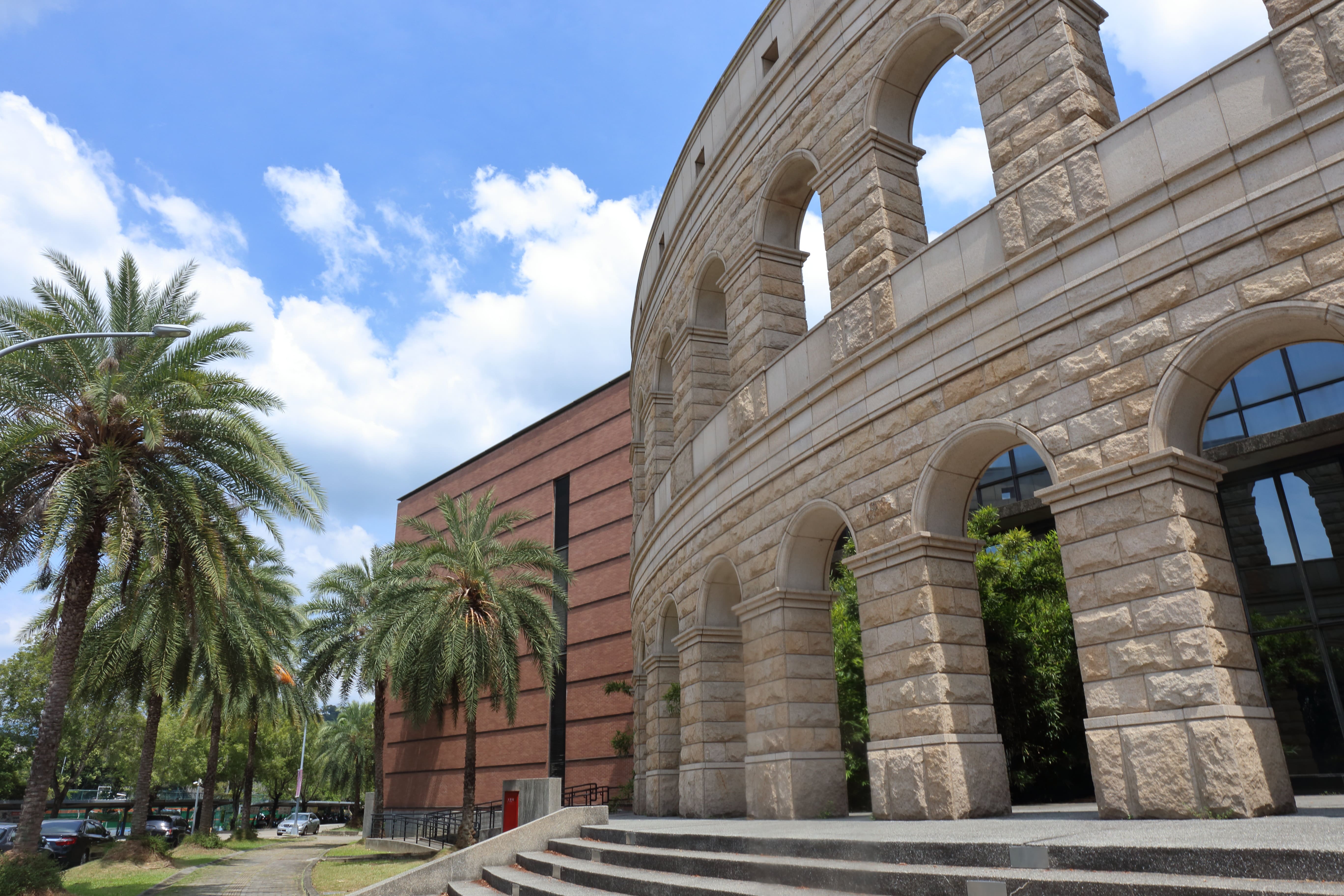 體育館外建的仿造羅馬競技場的圓弧形外牆,由米色花崗岩構築,分為上下兩層與拱頂,圓弧形的柱廊與綠色紅花高聳的鳳凰木相倚,無論用何種角度拍照都有閃光點,不是花季時候,綠葉或鳳凰木豆莢也都有不同的風采。