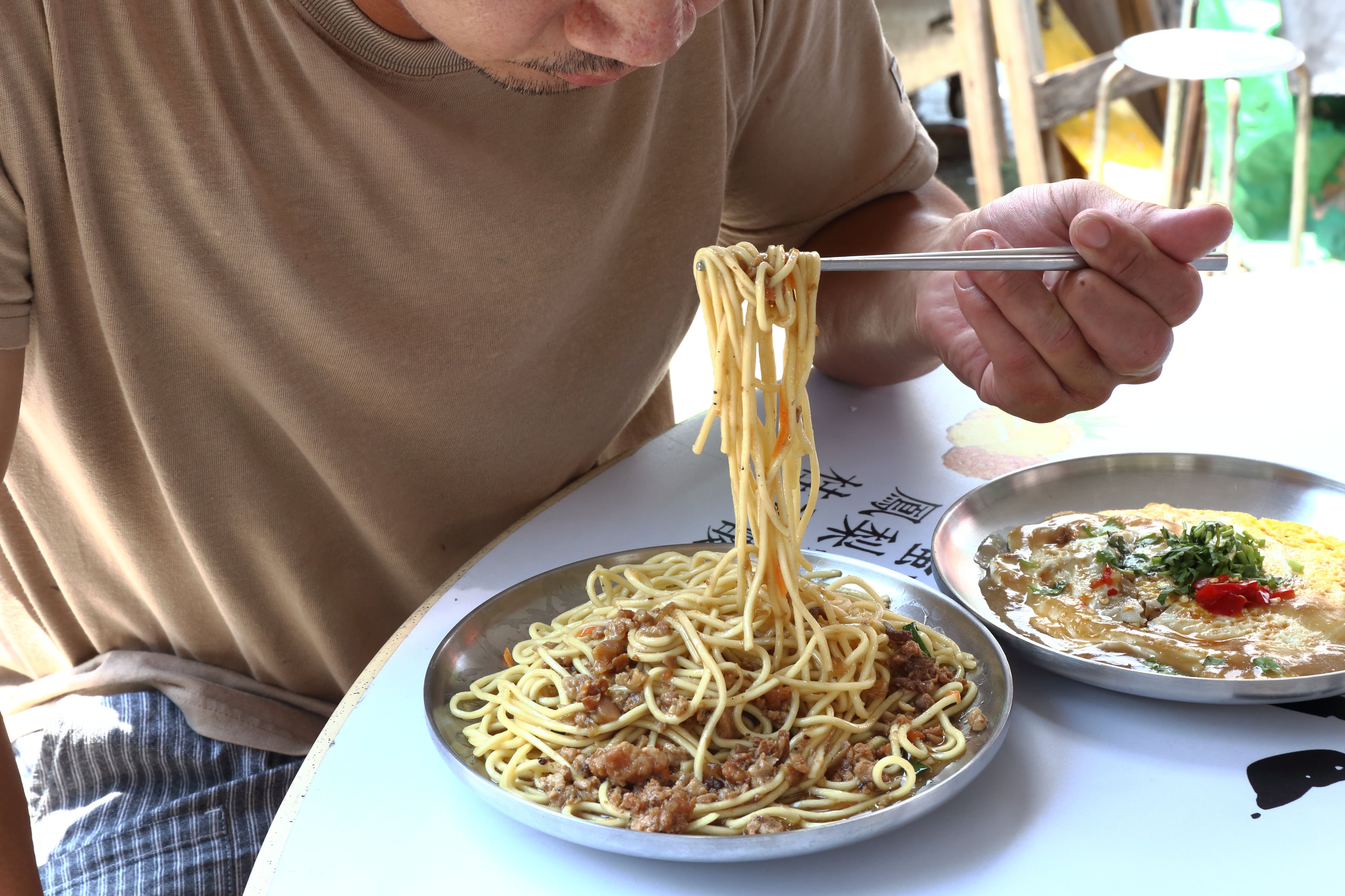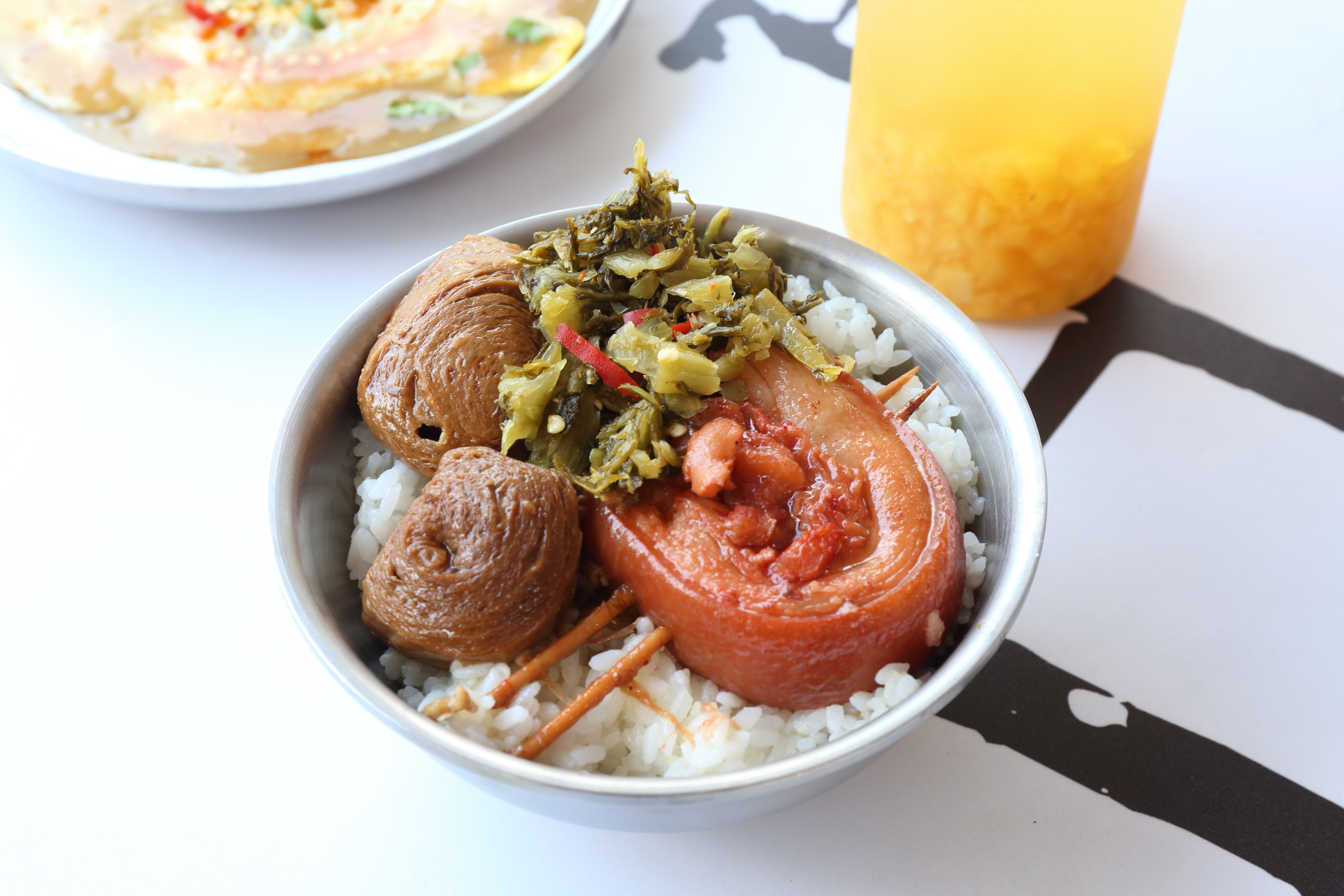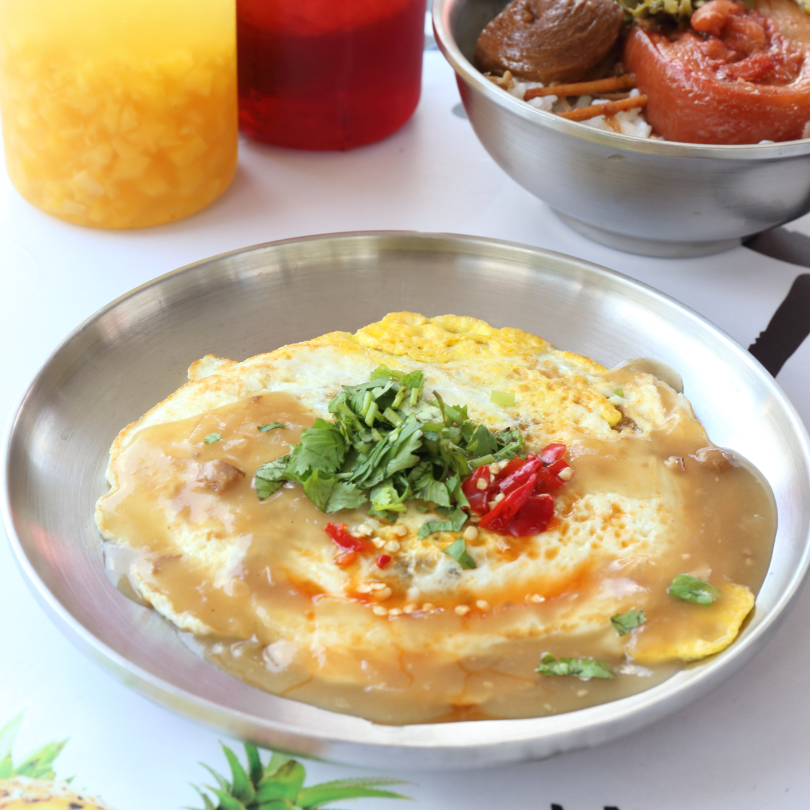 將煎得香脆的肉粿翻面撈起後再加上醬汁、香菜,想要的話還可以再加上一顆荷包蛋,老闆夫婦曾在肉粿的故鄉—台南,親自請教當地的老太太、媽媽們,將最道地的手藝學起來,再透過不斷的練習、嘗試,才做出現在這款南北人都好評的美味肉粿。